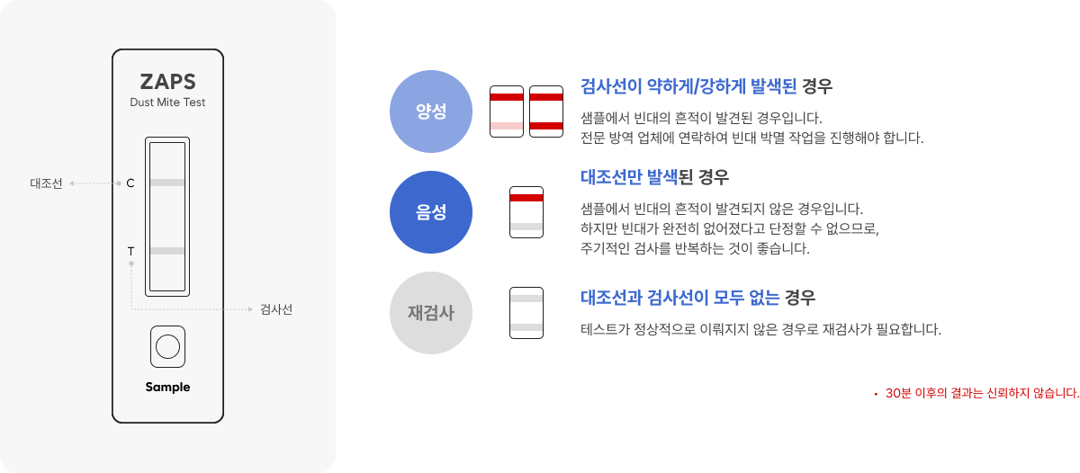 검사선은 빈대에 특이적으로 반응하며, 빈대항원이 있을 경우에 붉은색으로 발색됩니다.